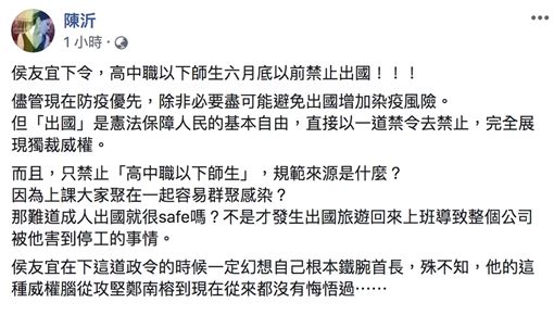 陳沂並疑惑表示:「那難道成人出國就很safe嗎?」且先前曾發生有民眾出國旅遊回來上班,但他因為他一人導致公司全面停工,陳沂痛批:「侯友宜在下這道政令的時候一定幻想自己根本鐵腕首長,殊不知,他的這種威權腦從攻堅鄭南榕到現在從來都沒有悔悟過」。