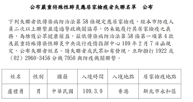 武漢肺炎(2019冠狀病毒疾病,COVID-19)疫情延燒,新北市民政局今天依傳染病防治法第58條第一項第4款及嚴重特殊傳染性肺炎中央流行疫情指揮中心109年2月7日函規定,公布應居家檢疫1失聯者姓名。民政局表示,失聯者為男性國人,居住永和區的盧禮勇,3月9日自香港入境,3月14日之前尚能聯絡上,之後失聯至今,經民政及警政連日努力協尋仍未找到,因此依規定公布失聯者姓名;請失聯者或民眾如有發現,立即撥打1922或(02)2960-3456分機7950與防疫機關聯繫。