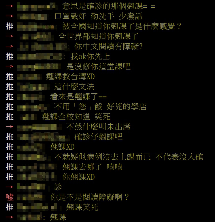 這則貼文曝光後,引來網友留言討論,「意思就是他蹺課」、「只是搞錯,不是你的課」、「代表真的有感染者,只是你沒碰到而已」、「愛蹺課有時候也是有好處的」、「被全國知道你蹺課了是什麼感覺」、「蹺課救全班」、「老師該給滿分,拯救生命,太偉大了」。