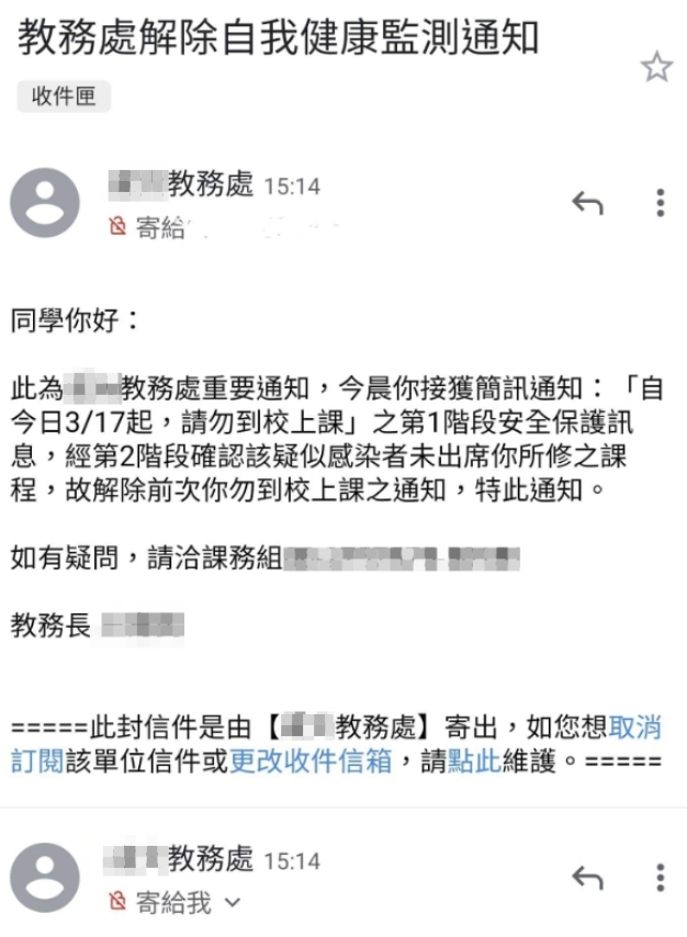 ▼南部某國立大學通知學生解除自我健康監測。(圖/翻攝自PTT)