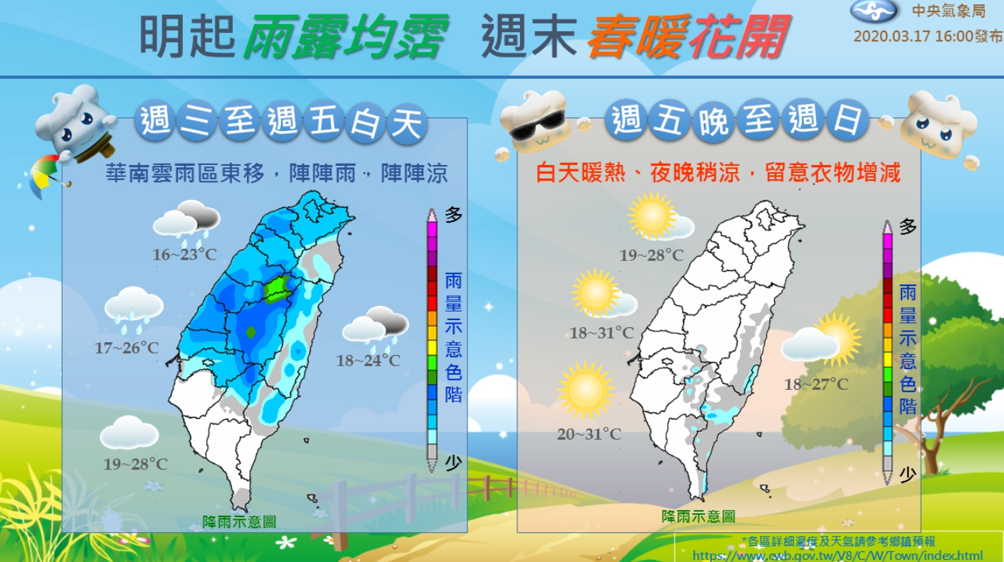 ▼從明(18)日開始到週五白天,天氣將受鋒面及華南雲雨區東移影響。(圖/中央氣象局)