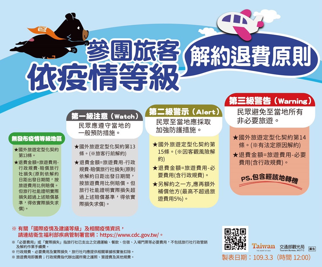 根據觀光局所發布的「參團旅客依疫情等級解約退費原則」,旅行業依照不同警示等級退費: