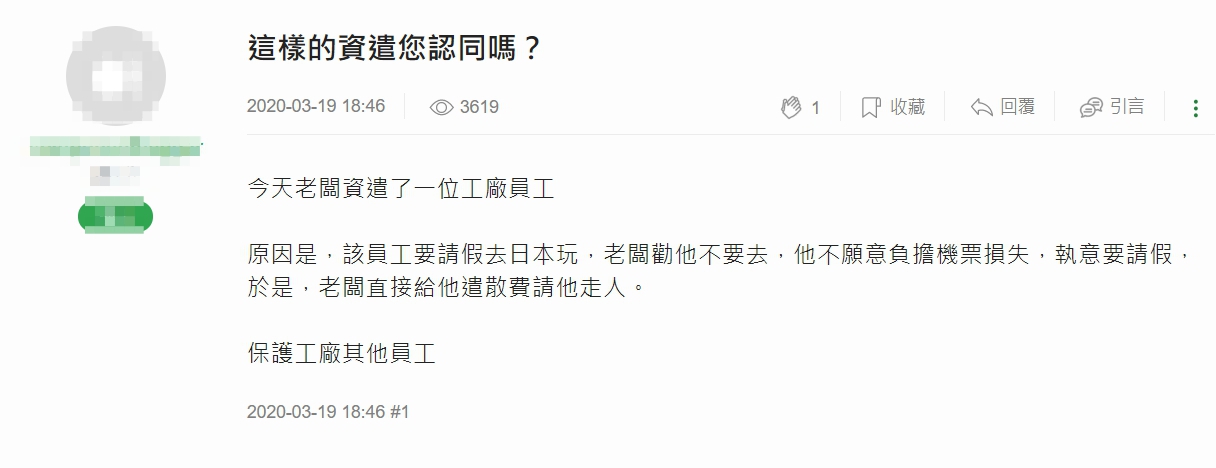 該名網友在Mobile01論壇網站表示,他的老闆最近資遣了一名工廠員工,因為該員工不想負擔機票損失,執意要請假去日本遊玩,在老闆苦口婆心的勸戒下,他仍不為所動,因此老闆決定直接給他遣散費,請他立刻走人,以保護工廠的其他員工。話鋒一轉,原PO轉而詢問其他網友,「這樣的資遣您認同嗎?」