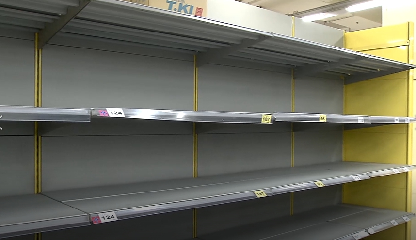 空的空的,還是空的,這是大賣場這幾天的畫面,架上的商品全搶購一空,包含衛生紙,泡麵,還有罐頭,幾乎人人都在搶,這也讓一下班,到賣場只是一般性購物的民眾,看了很無言。