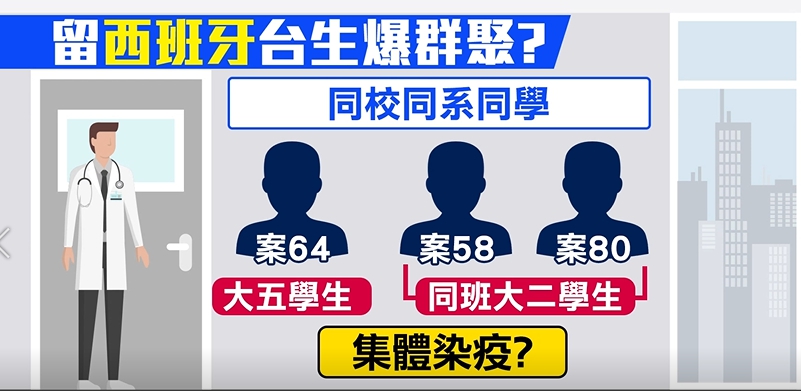 像是案58、案64、案80,是西班牙同校同系的同學,案64是大五學生,另外2人是同班大二學生,疑似爆發留學生集體染疫,關鍵點 ,恐怕是西班牙疫情相對嚴峻,接觸病毒機會也較高。