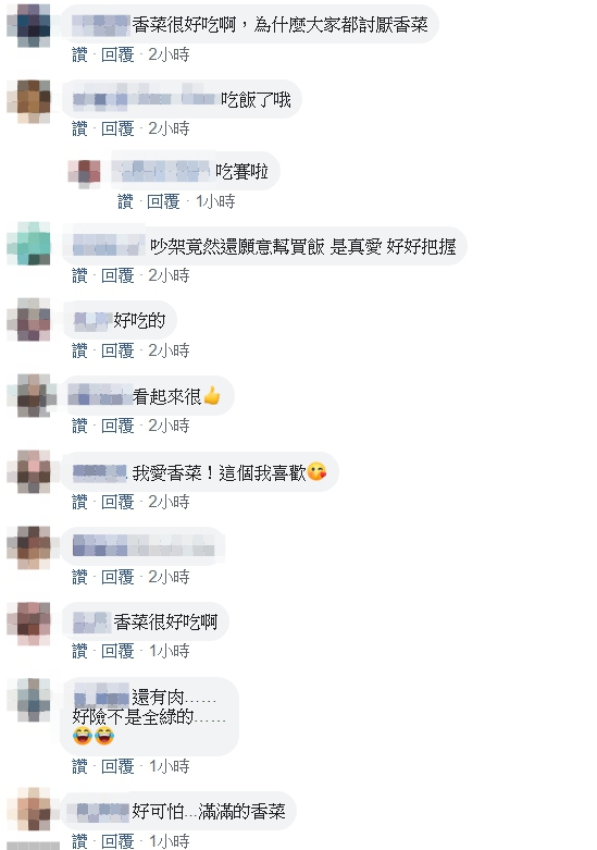 這張照片曝光後,許多網友看了都嚇傻,「甩了吧」、「世界上最噁心的便當」、「幫QQ」、「萬惡的噁心香菜」、「警告你的意味很濃,今天是這片草而已,下次再吵,可能每年四月要幫你砍草」、「隔著螢幕聞到味道,好可怕」、「有青椒…不行了,馬上和好」。