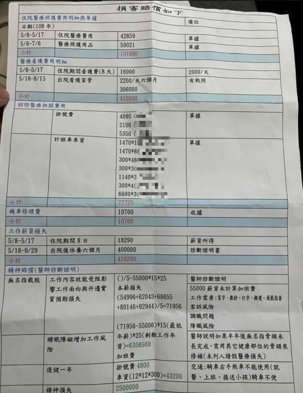 照片中清楚可見各項目的索賠金額,其中,精神損失就要求賠償250萬元,以及開出「工作內容效能受阻影響工作面向與升遷實質預期損失」的賠償項目,令不少網友直呼,「好笑的單子」、「太超過了,直接上法院吧」、「簡直天方夜譚啊」、「上法院給法官判就好了,不要害怕上法院」,不過也有不少網友則回應,「如果是你被撞斷一根無名指,你會想要對方賠多少錢?」、「覺得很合理啊」,也引起了兩派不同的聲浪。
