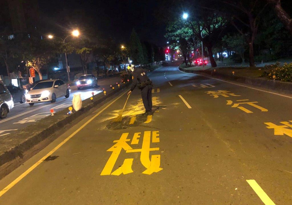▼高雄市員警正在清理鳥松區大埤路車道上的油漬。(圖/高雄市警察局仁武分局提供)