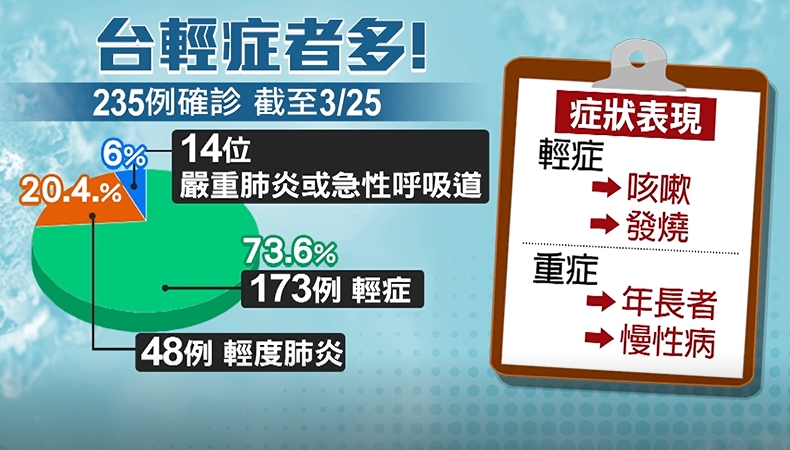 累計的235例確診中,173例為輕症比重占7成3,48例有輕微肺炎占2成,14例有嚴重肺炎 2人死亡。