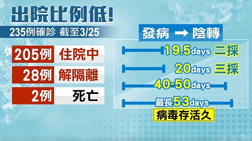 統計顯示,確診病患發病後,到第一套檢體呈現陰性結果,平均時間是19.5天,再改為三篩後,中位數更拉長到20多天,最長甚至到53天,顯示病毒存活在呼吸道時間相當久。