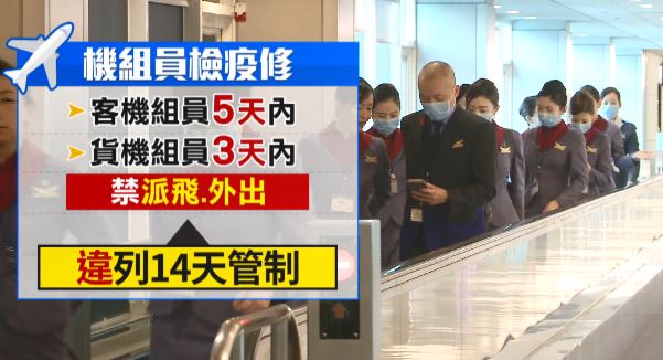 民航局修正部分規定,在居家檢疫原則下,貨機機組員返台後3天內,客機機組員返台後5天內,必須落實居家檢疫,不得派飛與外出,組員不管在國外或返國後違反相關規定,就通報 疾管署,列入居家檢疫14天管制。