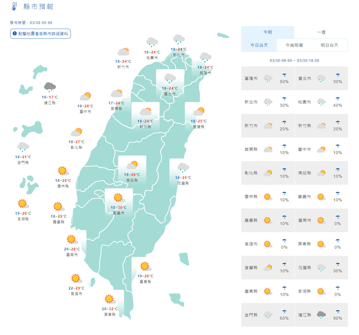 明(31)日東北季風減弱,各地氣溫回升,晨間低溫約17至21度,白天高溫普遍在26度以上,中南部地區甚至可達30至32度;周三(4月1日)鋒面通過,隨後東北季風增強,大氣環境不穩定,北部、東半部地區及中南部山區有短暫陣雨,中南部平地為多雲的天氣。值得注意的是,周四華南雲雨區東移造成水氣偏多,北部及東半部地區有短暫陣雨,中南部山區亦有局部降雨,中南部平地為多雲的天氣,將一直影響至下周日。