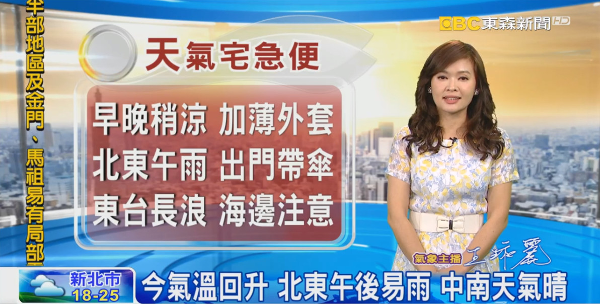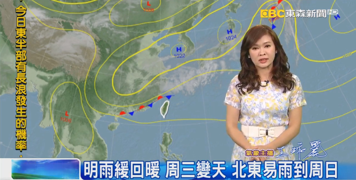 中央氣象局表示,今日東北季風減弱,氣溫呈現回升趨勢,清晨各地低溫17至21度間,白天北部及東半部地區高溫24至26度,中南部可達28至31度,中南部日夜溫差較大,請留意氣溫變化適時調整穿著;鋒面位於台灣北部海面,北部及東半部地區有局部短暫雨,中南部地區為多雲到晴的天氣。
