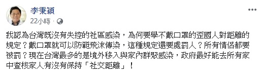 ▼李秉穎醫師認為台灣沒有失控的社區感染,不需要學外國人的規定。(圖/翻攝自李秉穎臉書)