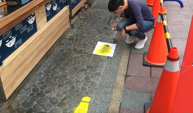 連服務台都把一公尺的間距,用線畫好,中央流行疫情指揮中心公布初步社交距離指引,原則室外間隔一公尺,室內保持一點五公尺,嘉義知名沙鍋魚頭就一度為此煩惱,因為一天至少150人排隊,排隊動線怎麼規劃,最後妥協在店門外放置三角錐,再用漆噴腳印,讓民眾依腳印排隊。