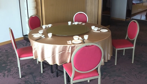 ▼飯店把原本可以坐10人的大圓桌,改成只放5張椅子。(圖/東森新聞)