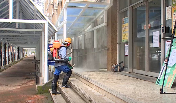 環保局人員協助台師大在校園裡全面消毒,因為校內一名大四學生沒有跨校選修,都以校車在宿舍跟校區間活動,近期更沒有出國,卻罹患武漢肺炎,感染源不明,成了全台大學首例本土確診案例。