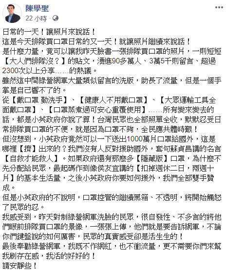 總統蔡英文日前指出,之所以捐贈1000萬片口罩,是因為台灣的口罩產能每日可產1300萬片,目前還在持續提升當中,即將達到1500萬片,這樣的行為不只會獲得世界的肯定,還能幫助疫情嚴重的國家醫療人員;前國民黨立委陳學聖就在臉書PO出一張口罩排隊照,認為這個畫面就足以說明一切,「所有變來變去的話,都是小英政府你說了算!台灣民眾也全部照單全收,默默忍受日常排隊買口罩的不便,就是因為口罩不夠,全民應共體時艱!」、「沒想到,小英政府竟然可以一下送出1000萬片口罩給國外,這是從哪裡擠出來的?」