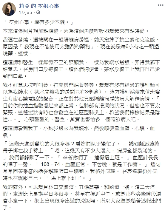 空服員莉亞日前在臉書《莉亞的空姐心事》發文,她表示自己執勤的班機雖沒有確診病例,但她卻在3月底因連續發燒3天到醫院就診,意外發現她肺部有發炎的情況,需要住院採檢,「心中小宇宙瞬間崩塌」,莉亞坦言自己不怕生病,只是擔心先前接觸過的親朋好友、同事,甚至乘客,「那樣巨大的內疚和擔心,瞬間吞噬了我的心和腦海。」