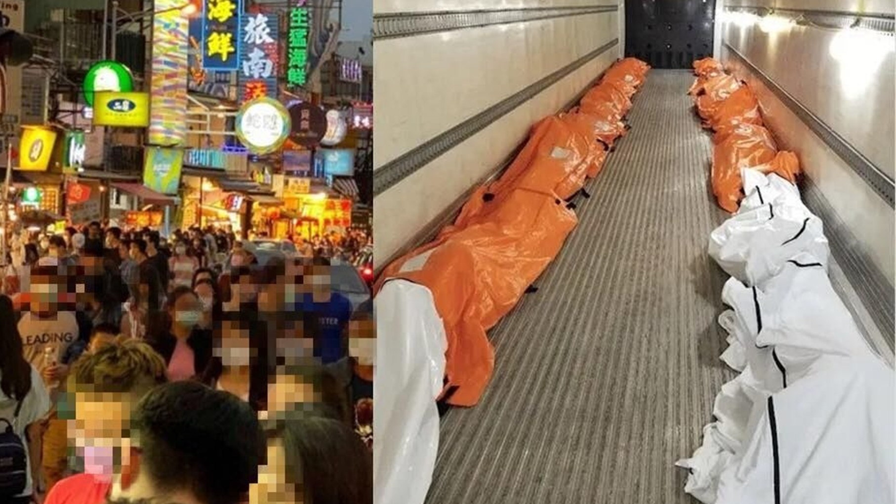▼醫師在臉書PO出對比圖,左側為墾丁大街,右側為紐約冷藏車內堆滿屍袋的照片。(圖/翻攝自Dr. E 小兒急診室日誌臉書)
