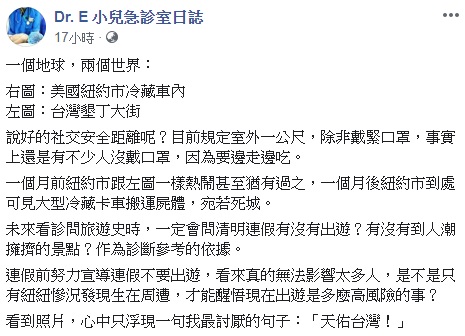 臉書粉絲專業「Dr. E 小兒急診室日誌」於昨(3)日發文,貼出一張對比圖,表示一個月前的紐約就跟左圖的墾丁大街一樣熱鬧,但一個月後宛如死城,不僅不再有熱鬧喧囂的景象,還到處可見大型搬運屍體的冷藏卡車,「未來看診問旅遊史時,一定會問清明連假有沒有出遊?有沒有到人潮擁擠的景點?作為診斷參考的依據。」