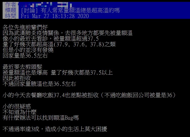 一名女網友在PTT上發文表示,因為武肺疫情的關係,去很多地方都要先被量體溫,最近去看診的時候,額溫都超過37.5以上,但奇怪的是,自己並沒有發燒,回家量溫度的時候也是36.5,最近要去剪頭髮,量額溫的時候也是爆高,好幾次被拒收,但回家量體溫的時候,溫度又回到36.5。