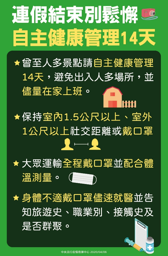 中央流行疫情指揮中心今(6)日表示,清明連假民眾南來北往互動頻繁,且部分觀光景點人潮密集,為確保國內社區防疫安全,民眾若在連假期間曾至人潮擁擠的地方活動,請自主健康管理14天,避免出入公共場所,外出時務必配戴口罩,儘可能在家上班。如有身體不適請撥打免付費防疫專線1922,就醫時務必告知旅遊史。