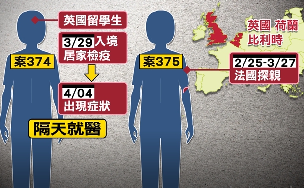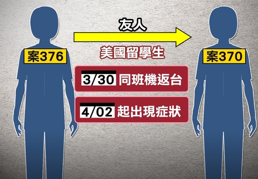 案375則是從2月25日開始到法國探親,將近一個月的時間,陸續到訪英國、荷蘭、及比利時,返台後出現症狀,7日確診,而案376美國留學生,是案370的朋友3月30日和朋友一起返台後,被列為居家隔離接觸者,這個月2日到5日,開始出現症狀,採檢後確診。
