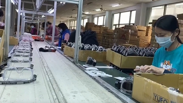 把裝到塑膠袋裡頭的護目鏡一個一個封膜順帶裝箱,工作人員忙碌的手沒有停過,因為全球疫情升溫,護目鏡需求量大增,生產業者都在趕工。