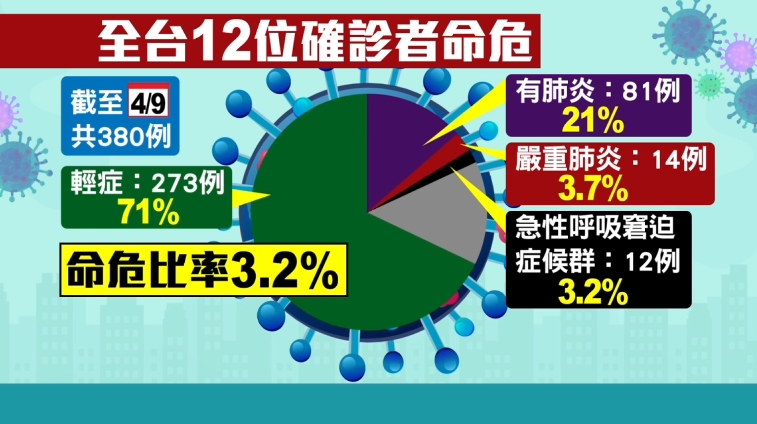 過去也曾有人對SARS病患,以及禽流感患者使用IL6,但都屬於嘗試性療法,民眾可別輕忽了武漢肺炎的威力,因為以4/9前,國內確診的380例來看,除了7成屬於輕症,高達2成共81人有肺炎,14人進入嚴重肺炎,甚至12人急性呼吸窘迫,有生命危險,等於命危比率高達3.2%。