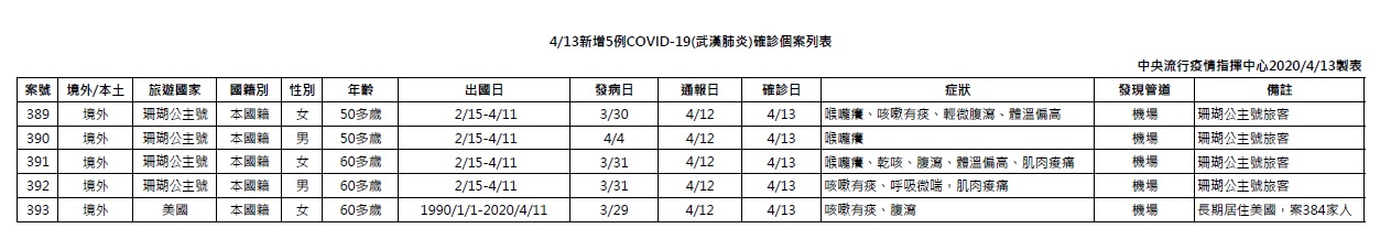 根據指揮中心公布資料,案393為本國籍60多歲婦人,長期居住在美國,出國日自1990年1月1日至今年4月11日,隔了近30年才返台,並於3月29日發病、4月12日通報,4月13日確診。