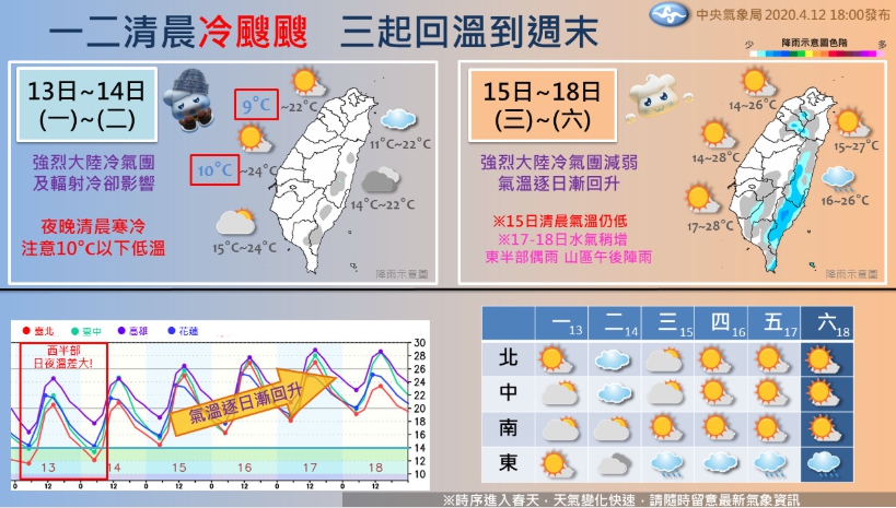 根據氣象局資料顯示,15日、16日受東北季風影響,各地早晚較涼;東半部地區及北部山區有局部短暫雨,其他地區為多雲到晴;17日、18日東半部地區及南部地區有局部短暫陣雨,其他地區為多雲,午後山區有局部短暫雷陣雨。
