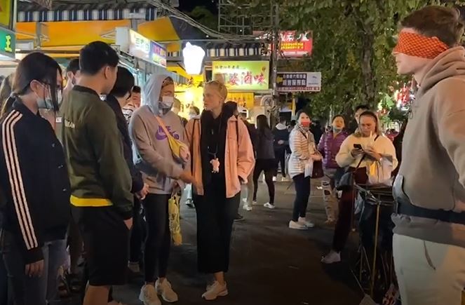 一名外國男子,矇著眼,張開雙臂,站在夜市走道旁,吸引民眾圍觀。