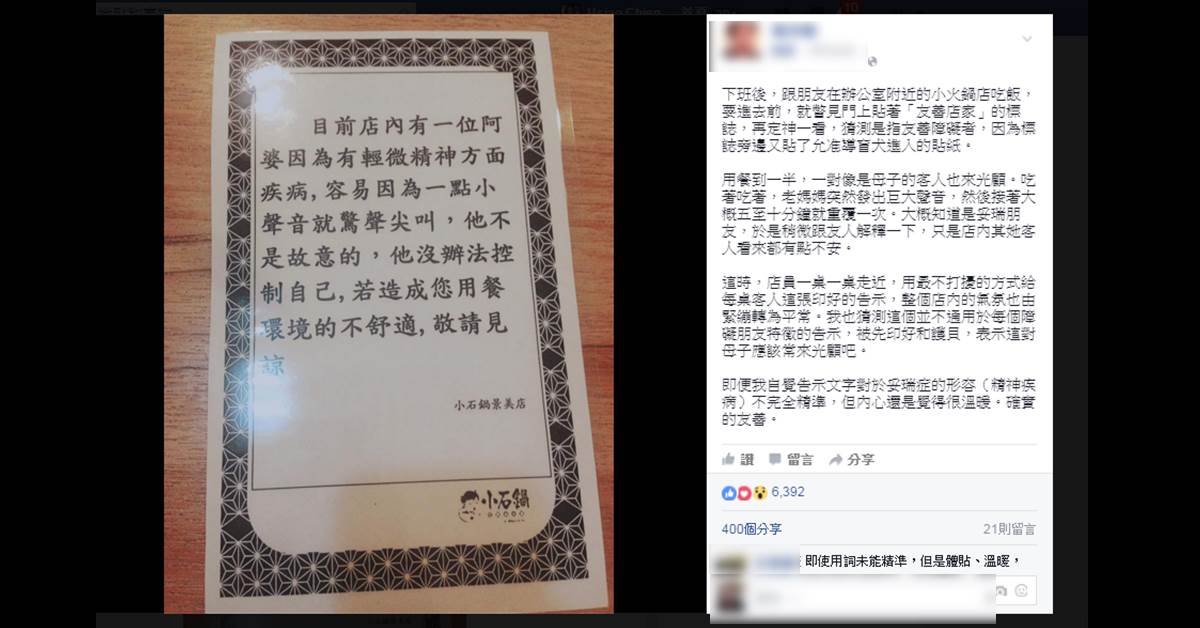 「目前店內有一位阿婆因為有輕微精神方面疾病,容易因為一點小聲音就驚聲尖叫,他不是故意的,他沒有辦法控制自己,若造成您用餐環境的不舒適,敬請見諒。」客人們看完這張告示後,店內的氣氛也由緊繃轉為平常。