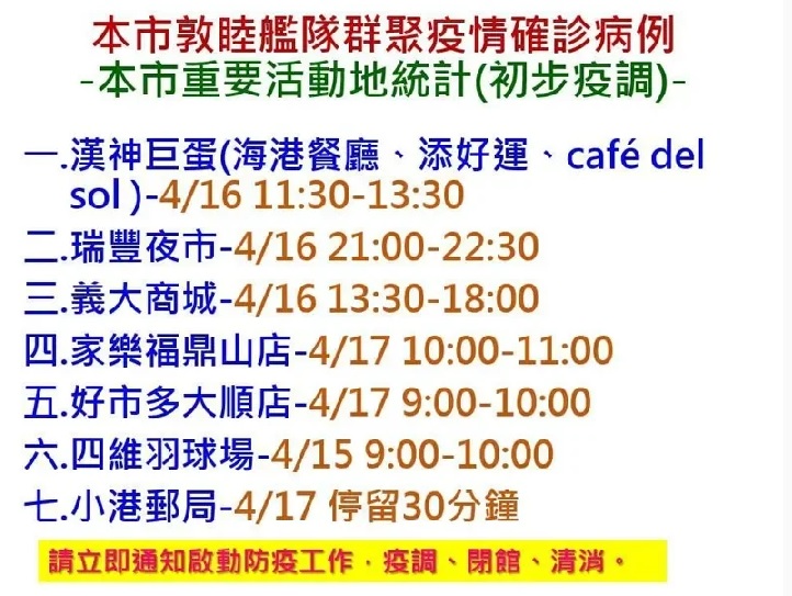 國軍敦睦艦隊昨天爆3例確診,今天又新增21例與敦睦艦隊確診案例。根據疫情調查,敦睦艦隊於今年3月12日至15日停靠帛琉,離開帛琉後於公海航行近30天,4月15日自台灣左營軍港下船。據了解其中8名確診個案在高雄,高雄市長韓國瑜今天公布他們去過的7處足跡熱點,包括漢神巨蛋(海港餐廳、添好運、cafe del sol)、瑞豐夜市、義大商城、家樂福鼎山店、好事多大順店、四維羽球場及小港郵局。高雄市府也急封好市多等7處,並消毒停業1天!