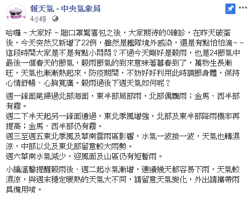 中央氣象局今日於臉書專頁「報天氣」貼出一張下周天氣圖,並寫道,今天剛好是穀雨,是24節氣中最後一個春天的節氣,穀雨節氣的到來,也意味著暮春到了,萬物生長漸旺,天氣也會逐漸熱起來,在防疫期間,要好好利用這個時間調節身體,保持心情舒暢和心胸寬廣。