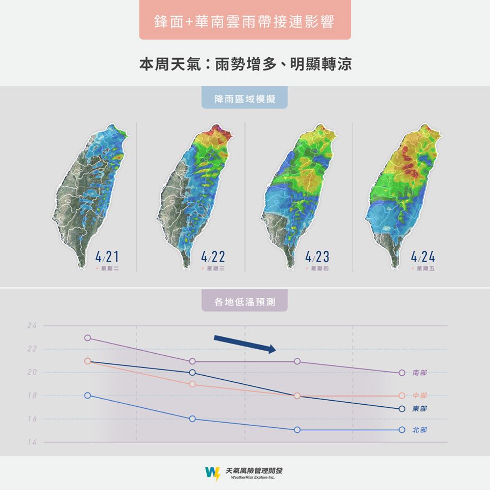 天氣風險提到,自週三起,東北季風增強,北部、中部地區氣溫明顯下滑;週四(23日)起華南雲雨帶移來,全台各地依舊維持有雨的天氣型態,直到週六(25日)華南雲雨帶遠離後,雨勢才會漸漸停止。