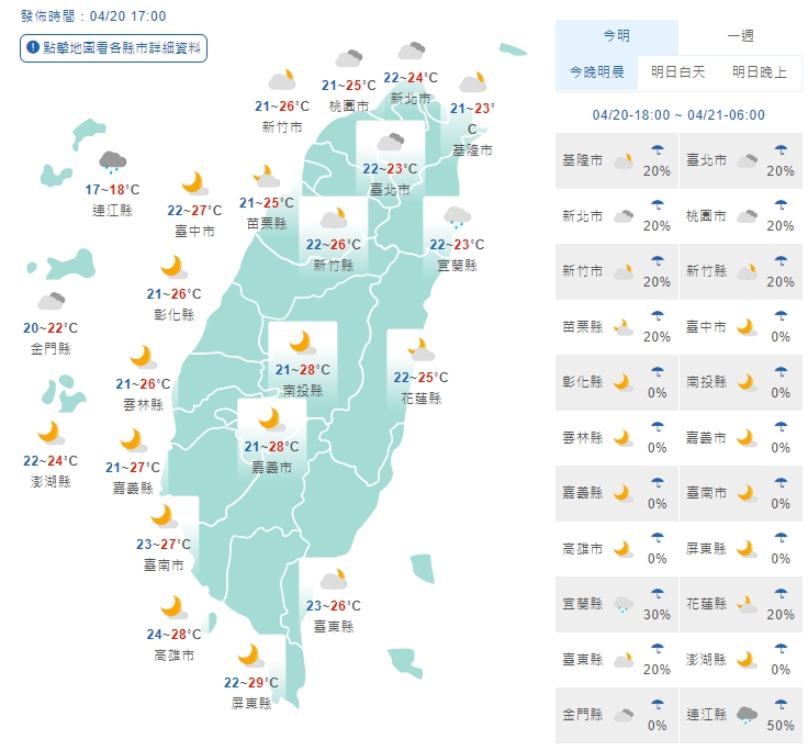 今(20日)微弱鋒面掠過台灣北部海面,北部水氣略為增多,有零星短暫雨,中午之後放晴,全台白天高溫介於26度至33度之間。天氣風險公司傍晚在臉書表示,明(21日)晚間起變天,隨著鋒面接近,本週將會有愈來愈濕涼的趨勢。