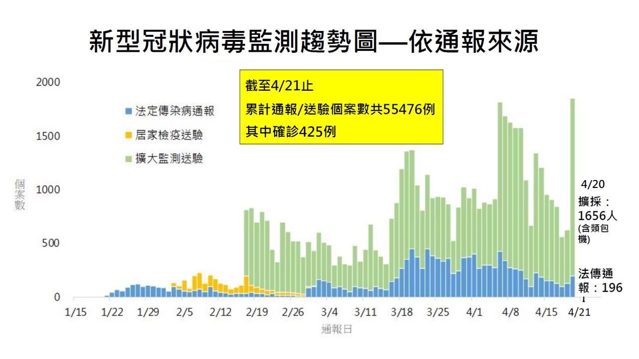 ▼國內截至4/21止,累計通報/送驗個案數55476例,其中確診425例。(圖/疫情指揮中心提供)