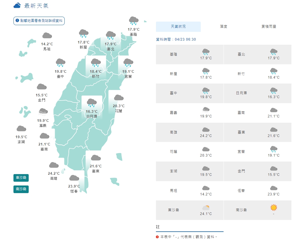 降雨方面,今明受華南雲雨區及東北季風夾擊,全台有雨,氣象局更針對台北市、新北市、基隆市與宜蘭縣發布大雨特報,北部、東半部、馬祖有短暫陣雨,中南部、澎湖、金門也有局部短暫陣雨或雷雨,25、26日東北季風減弱,雨勢也會趨緩。