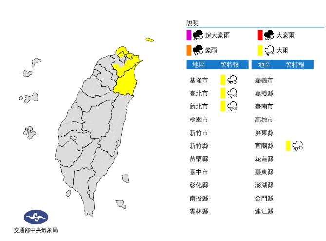 ▼氣象局針對台北市、新北市、基隆市與宜蘭縣發布大雨特報。(圖/中央氣象局)