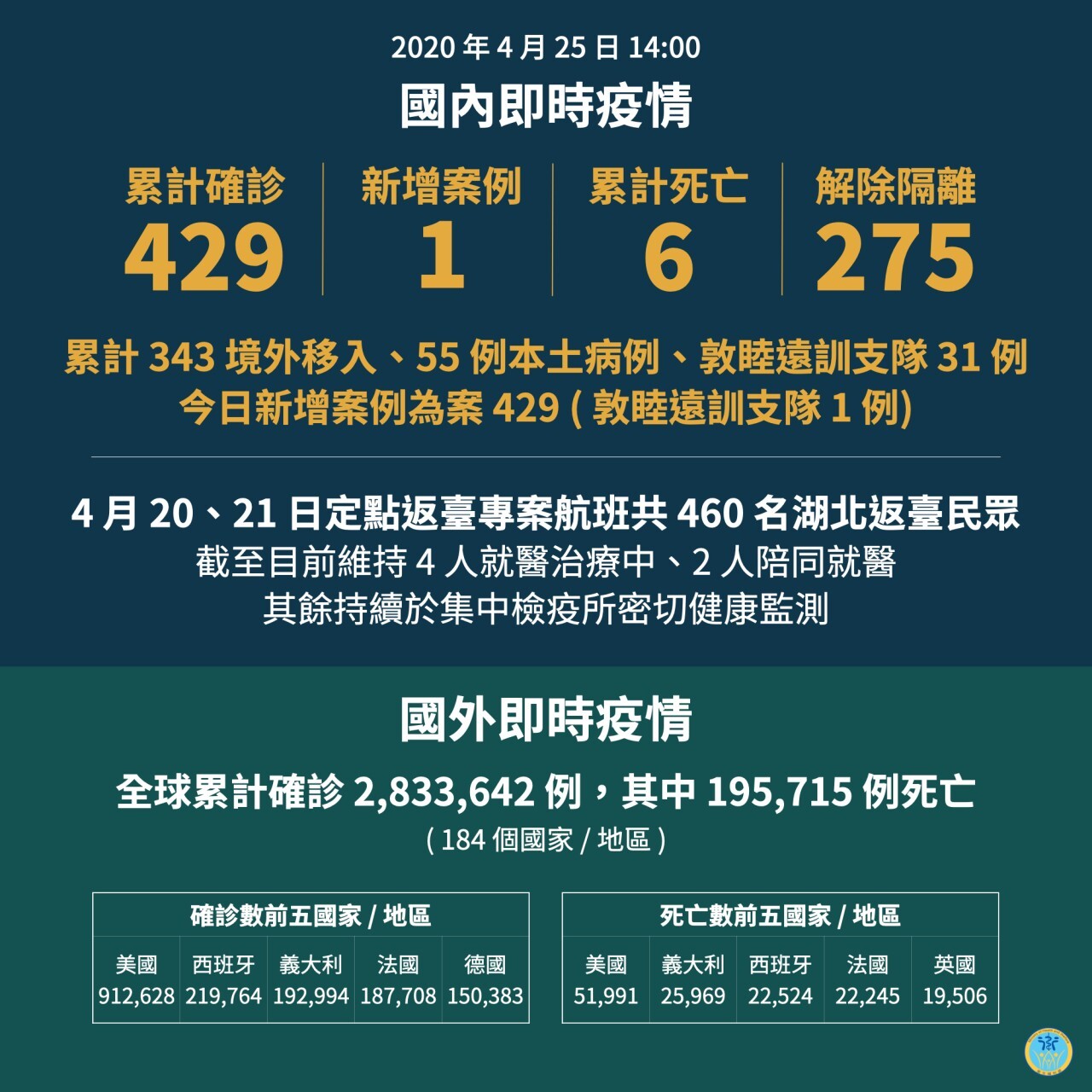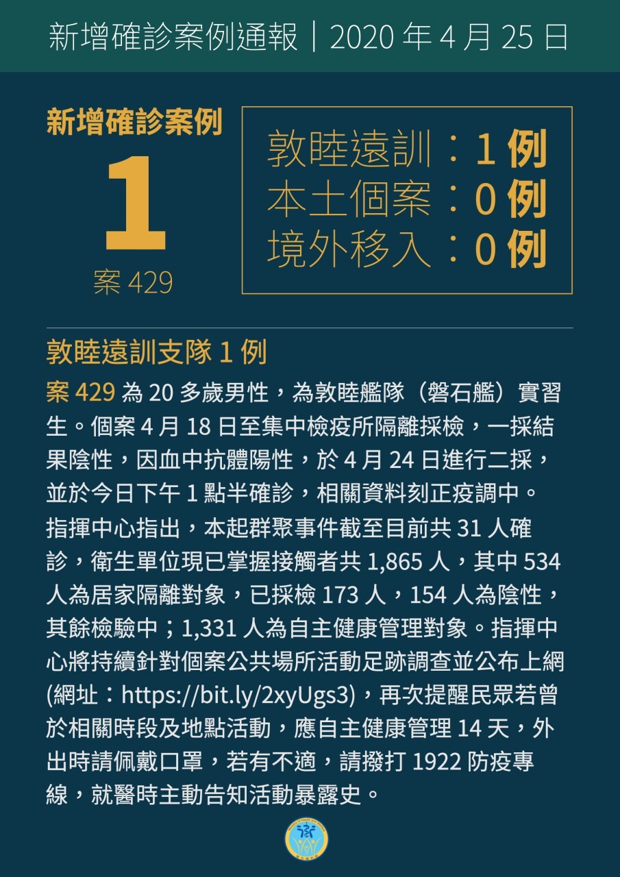 中央流行疫情指揮中心今(25)日公布國內新增1例COVID-19(武漢肺炎)病例,為20多歲男性,為敦睦艦隊(磐石艦)實習生。個案4月18日至集中檢疫所隔離採檢,一採結果陰性,因血中抗體陽性,於4月24日進行二採,並於今日下午1點半確診,相關資料刻正疫調中。