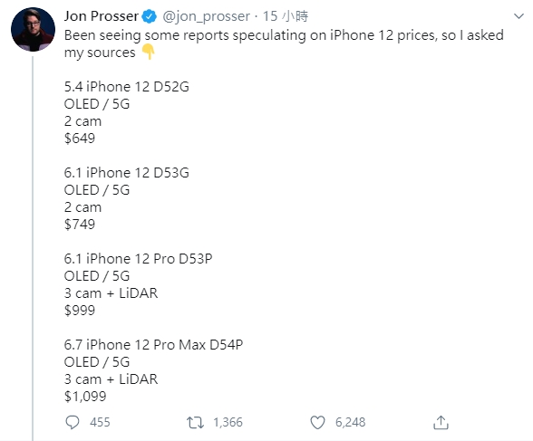 ▼知名的蘋果產品爆料人 Jon Prosser也在推特公開了iPhone12的售價。(圖/翻攝自Jon Prosser推特)