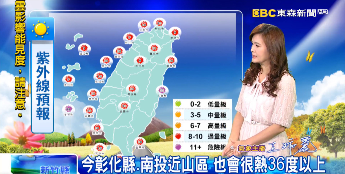 中央氣象局表示,今日白天溫暖,高溫普遍可達30度以上,其中大台北地區及中南部地區高溫更可達32、33度,南部近山區及河谷有機會達到36度以上,各地紫外線指數偏高,提醒外出做好防曬工作並多補充水分;各地大多為晴到多雲的天氣,僅午後東北部、東部地區及中部以北山區雲增偶有零星雨,午後前往山區活動請留意。