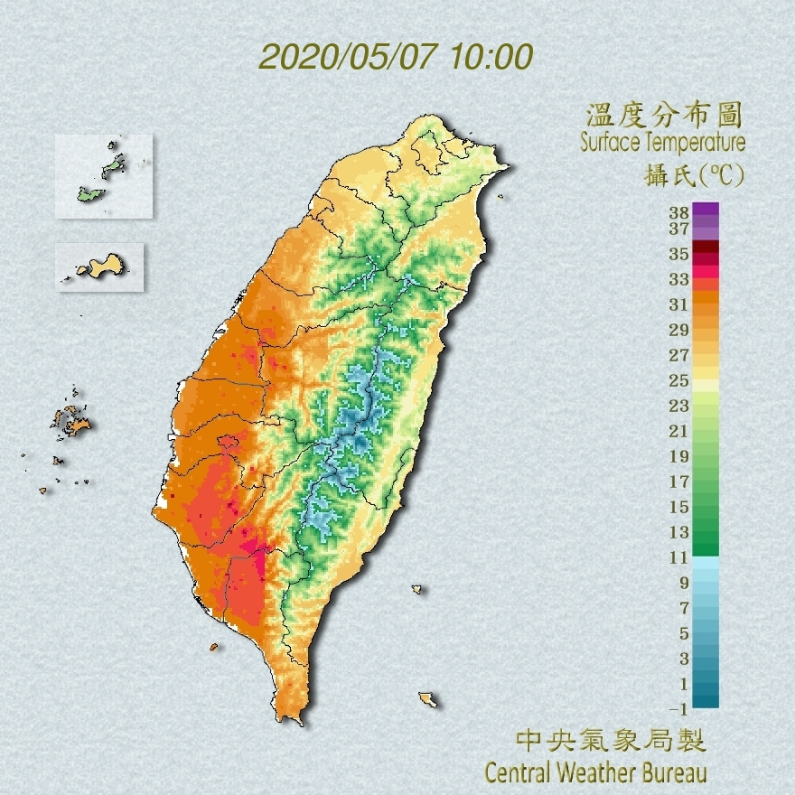 雖然今天溫度較昨天稍降,不過氣象局仍針對南投縣、台南市、高雄市和屏東縣發出高溫資訊,提醒民眾中午前後仍有出現攝氏36度以上高溫機率。