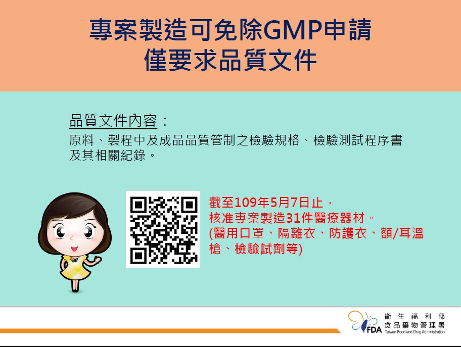 指揮中心表示,為落實推動國家防疫團隊的使命,強化防疫物資量能,食藥署積極輔導廠商提出專案製造申請,參考其他國家作法,簡化送審資料,免除製造廠GMP申請,僅要求檢附製造品質及產品安全效能檢測資料,全程免收取規費,加速產品上市。民眾如要查詢專案製造核准相關情形、參考文件、法規諮詢訊息,可至食藥署官網http://www.fda.gov.tw(首頁 > 業務專區 > 醫療器材 > 最新消息)查詢。