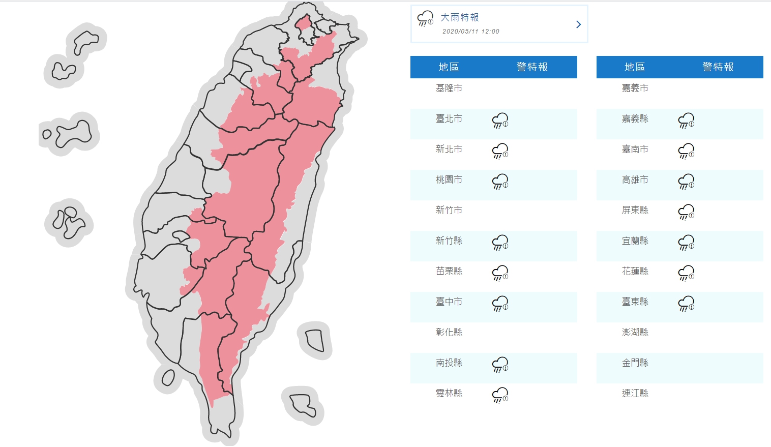 氣象局指出,今、明(11日、12日)兩天鋒面通過及東北風增強,今日全台各地有局部短暫陣雨或雷雨,午後東半部地區及西半部山區有局部大雨發生的機率;明日北部及東北部地區有局部短暫陣雨或雷雨,其他地區為多雲,午後東部、東南部地區及中南部山區有局部短暫雷陣雨,並有局部大雨發生的機率。