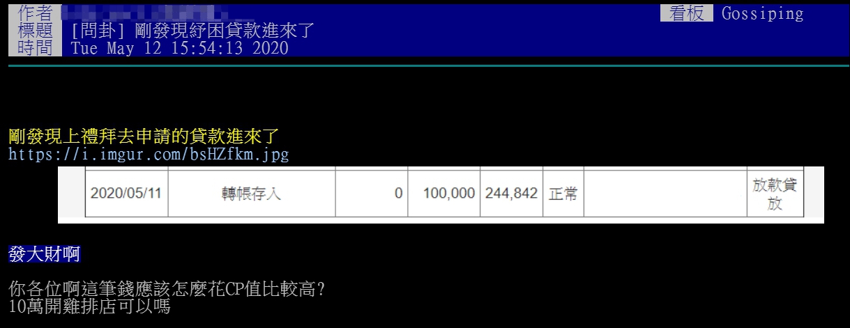 「剛發現上禮拜去申請的貸款進來了,發大財啊!」一位網友在PTT發文,開心直言已經拿到10萬元貸款,在興奮之餘原PO也詢問,「這筆錢應該怎麼花CP值比較高?10萬開雞排店可以嗎?」最後他也貼出自己的存款明細,證明自己真的有拿到勞工紓困貸款。