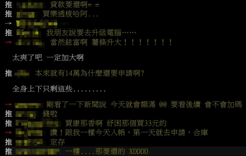 這則貼文曝光後,引來大批網友論戰,「有14萬還可以過生活吧,幹嘛貸款」、「本來的14萬就夠活了吧,貸這種幹嘛」、「X!老子還沒得領」、「台灣人真的一堆貪!一堆明明沒有緊急受困生活者也去貸款」。