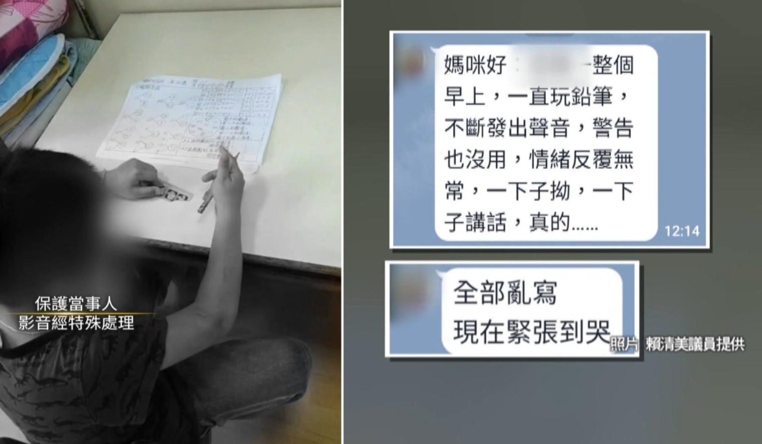 小男童坐在書桌前,無辜的看著老師,緊張的小手抓著橡皮擦跟鉛筆,他被老師念調皮顧著玩,不寫數學考卷,被拍下影片要給爸媽看。